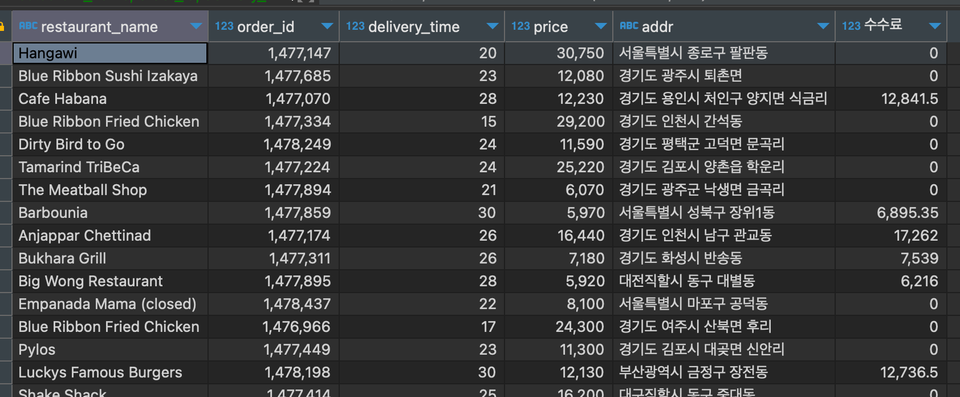 - (지역 : 서울, 기타 - 서울일 때는 수수료 계산 * 1.1, 기타일 때는 곱하는 값 없음 시간 : 25분, 30분 - 25분 초과하면 음식 가격의 5%, 30분 초과하면 음식 가격의 10%)
