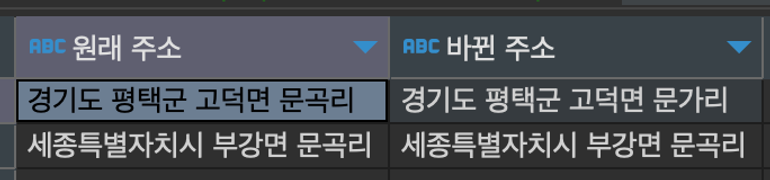 - ex) ‘문곡리’ 가 평택에만 해당될 때, 평택 ‘문곡리’ 만 ‘문가리’ 로 수정