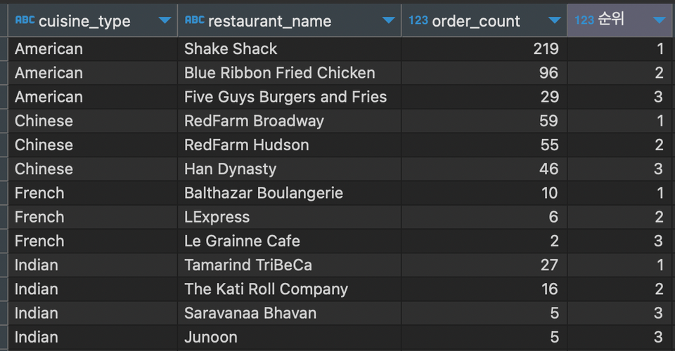 - 3위까지 조회하고, 음식 타입별, 순위별로 정렬하기