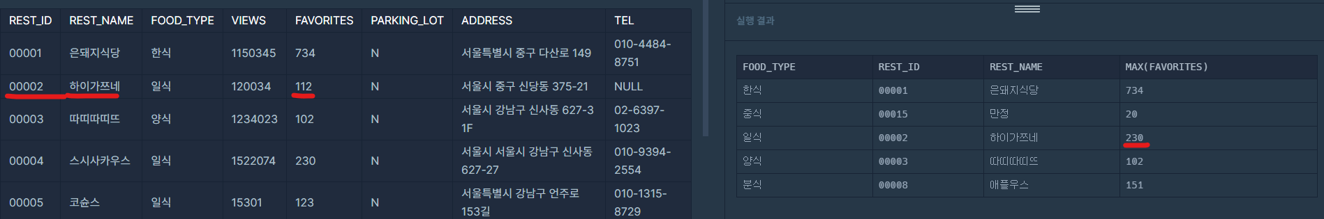 따라서 음식점 종류 별 가장 큰 FAVORITES 값들을 뽑되, 해당 MAX FAVORITES 값과 일치하는 FAVORITES 레코드들을 WHERE 절로 검색하여 가져온 후 보여주면 정답이 된다.