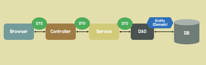 프로세스 간에 데이터를 전달하는 객체로, 비즈니스 로직 같은 복잡한 코드 없이 getter/setter 메소드와 순수하게 전달하고 싶은 데이터만 담겨있다. 계층 간 데이터 전송을 위해 도메인 모델 대신 사용되는데, 여기서 계층이란 Presentation (View, Controller), Business(Service), Persistence(DAO, Repository) 등을 의미한다.