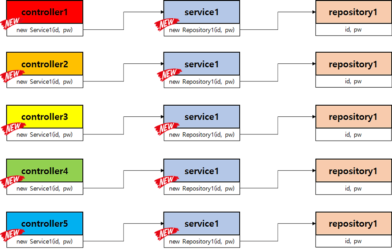 1. Contoller1 이 Service1 객체를 생성하여 사용