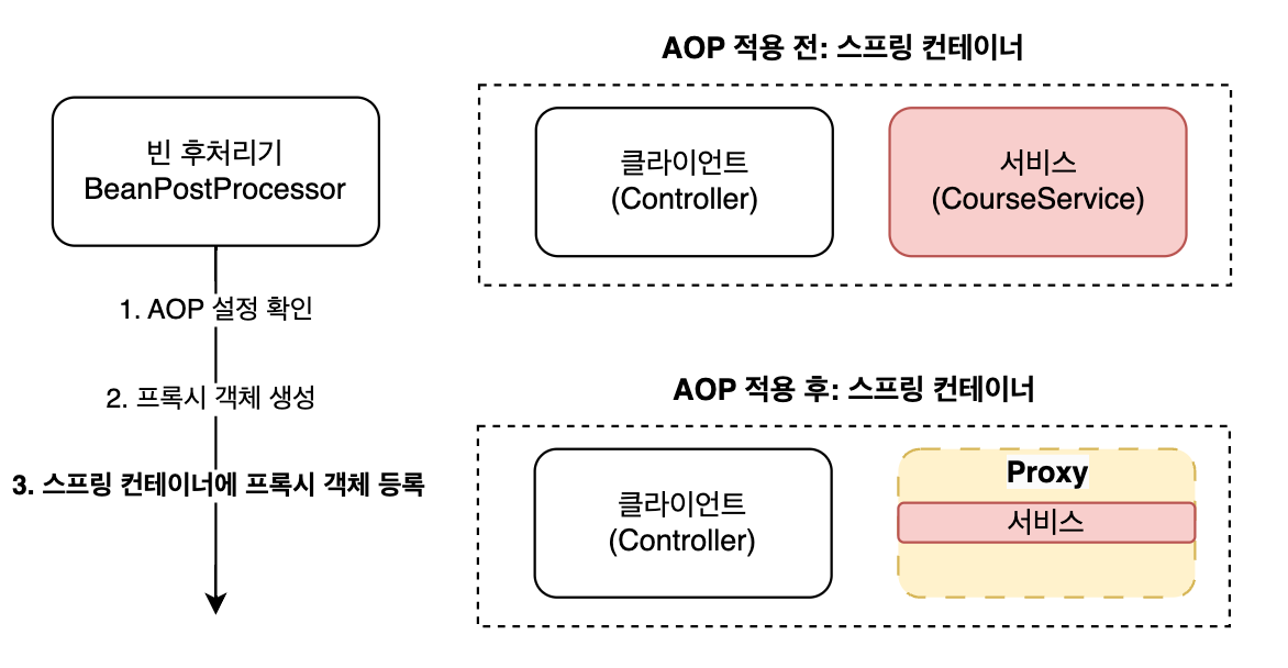 스프링에서 객체를 빈으로 등록할 때 빈후처리기를 거치게 되는데, 이때 빈후처리기는 AOP 설정이 적용된 객체를 감지하고 해당 객체를 프록시 객체로 감싼 후 스프링 컨테이너에 등록하게 된다.