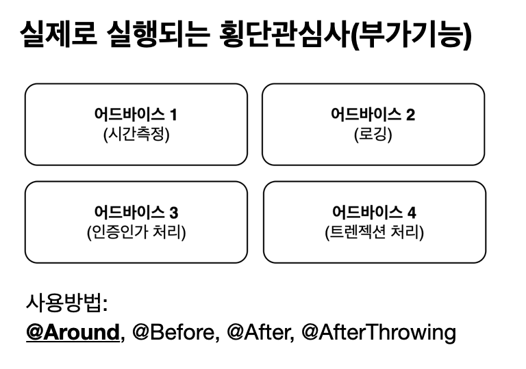 - 횡단관심사 : 여러 곳에서 공통적으로 발생하는 부가기능