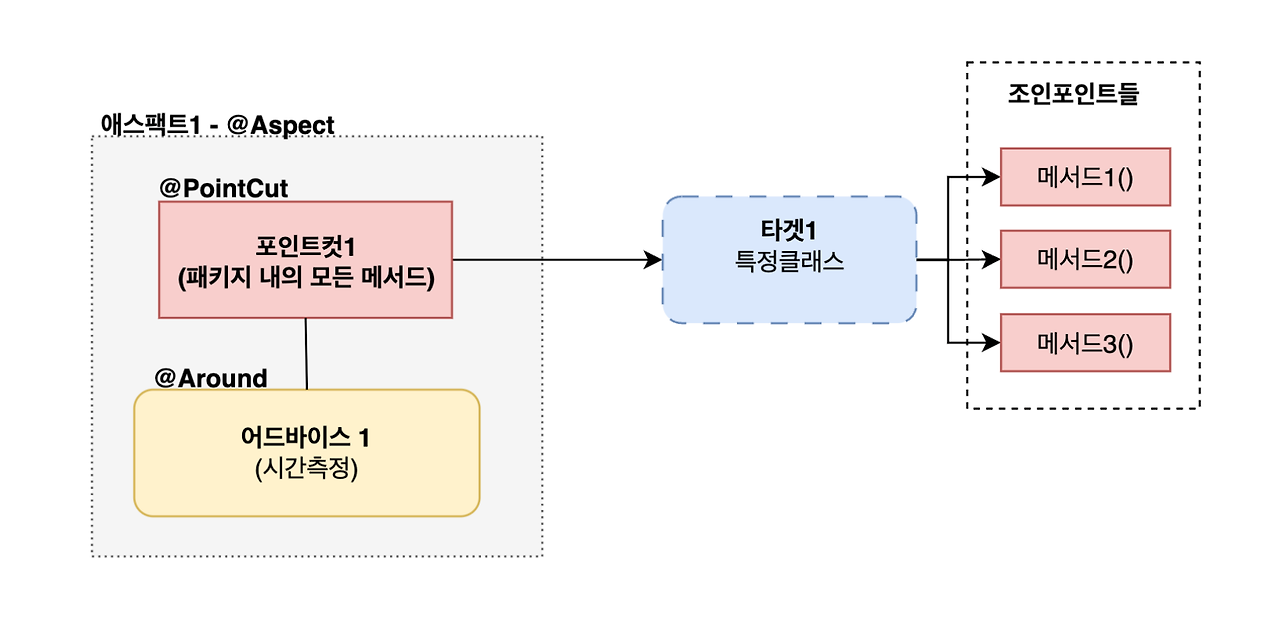 어드바이스가 적용되는 객체를 의미한다. 포인트컷으로 적용된 특정 클래스가 타겟이 되면, 그 클래스 내의 모든 메서드들이 어드바이스의 적용을 받게 된다.