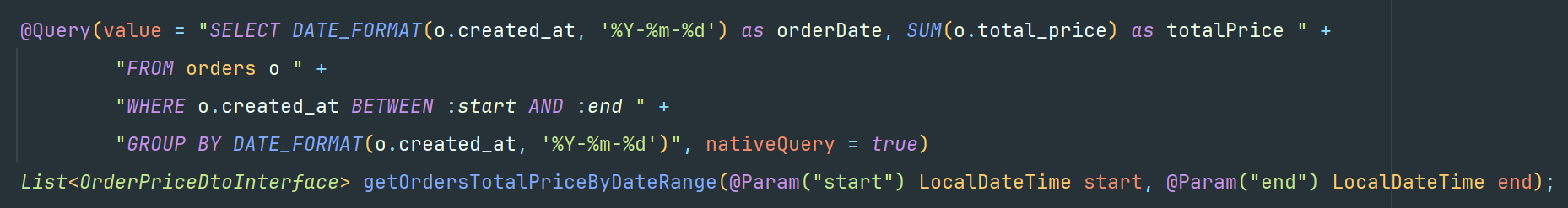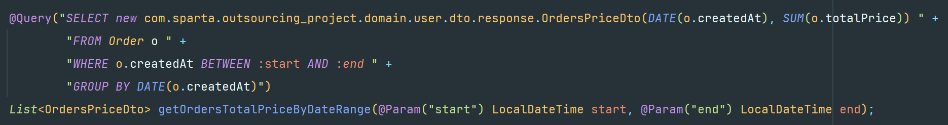 public List<OrdersPriceDto> getOrdersTotalPriceByDateRange(LocalDateTime start, LocalDateTime end) {