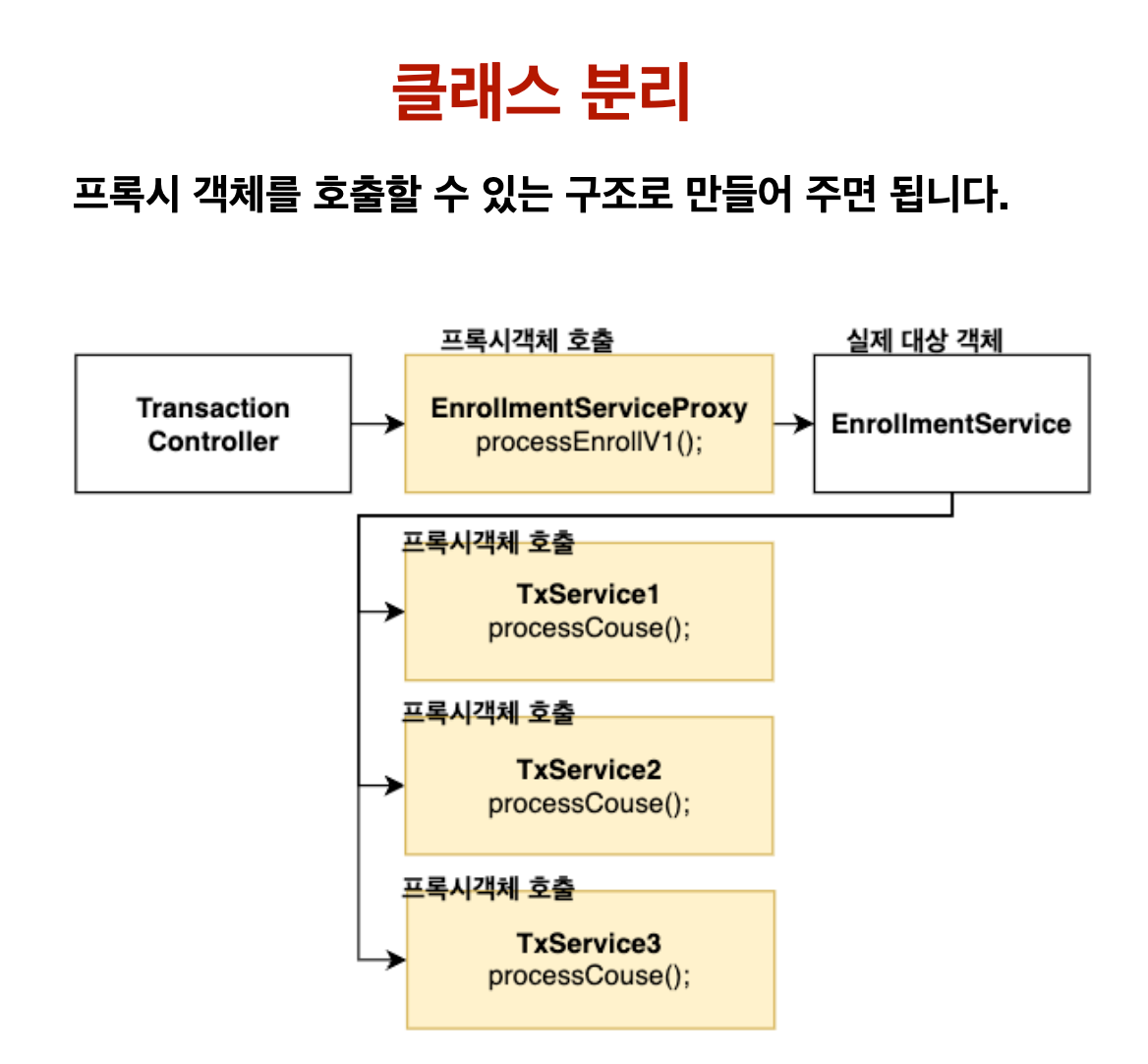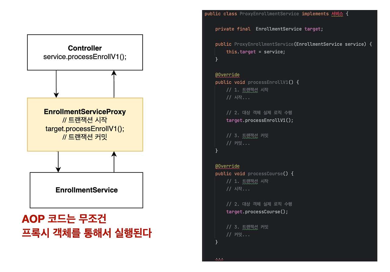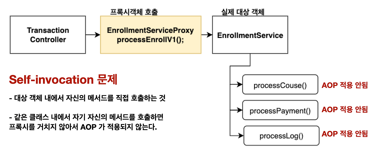 processCourse(), processPayment(), processLog() 는 Target(EnrollmentService) 본인 스스로가 본인의 메서드를 호출한 것이기 때문에 proxy 가 적용이 되지 않는다. 그렇기에 트랜잭션을 적용하고 싶다면 자기 자신의 메서드를 호출하는 것이 아니라, 따로 클래스를 만들어서 호출해줘야 한다.