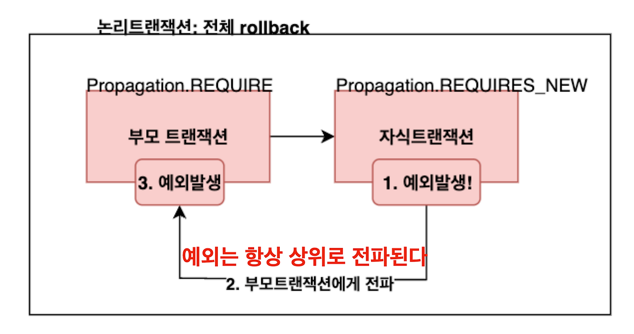 REQUIRES_NEW 라고 하면 완전히 분리된 전파 속성으로 받아드리는 경우가 많은데, 별도의 트랜잭션이라고 하더라도 하위 메서드에서 발생한 예외는 항상 상위 메서드로 전파되기 때문에 예외처리를 적절하게 해줘야 한다. 아니라면 REQUIRES_NEW로 새로운 트랜잭션을 생성했어도 자식에서 예외 발생하면 다 같이 롤백되는 수가 있다.