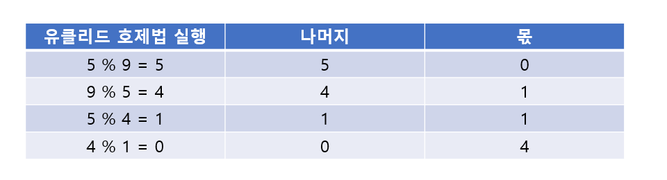 2. a, b로 유클리드 호제법을 반복 실행하며 몫, 나머지를 저장한다. 반복은 나머지가 0이 되면 중단한다.