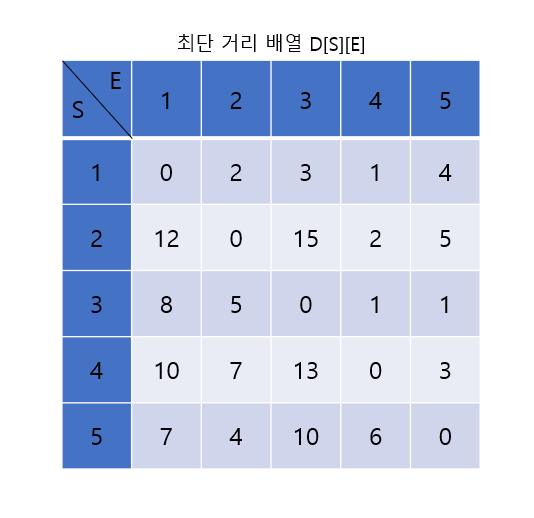 D[S][E]는 노드 S에서 노드 E까지의 최단 거리를 저장하는 배열이라 정의한다. S와 E의 값이 같은 칸은 0, 다른 칸은 ∞로 초기화한다. 여기에서 S == E는 자기 자신에게 가는 데 걸리는 최단 경로값을 의미하기 때문이다.